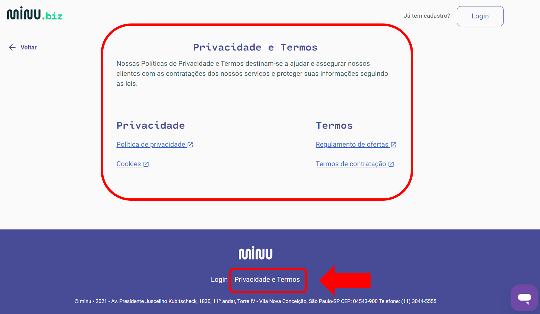 Você pode encontrar os detalhes sobre privacidade e os termos de uso na página inicial também, antes mesmo de fazer o login na plataforma: