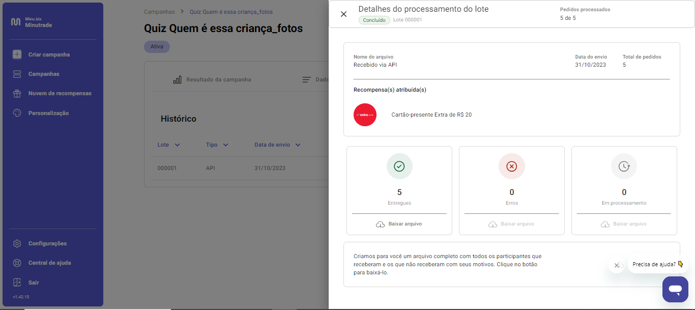 Em detalhes, você consegue ter acesso ao que foi entregue, se teve algum erro e o que está em processamento.