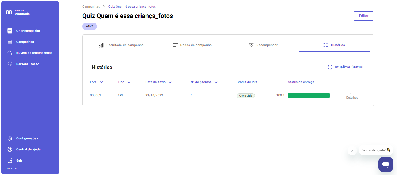 Na aba histórico você vai ter acesso a todos os arquivos que foram enviados para entregar a recompensa ao cliente. Clique em Detalhes :