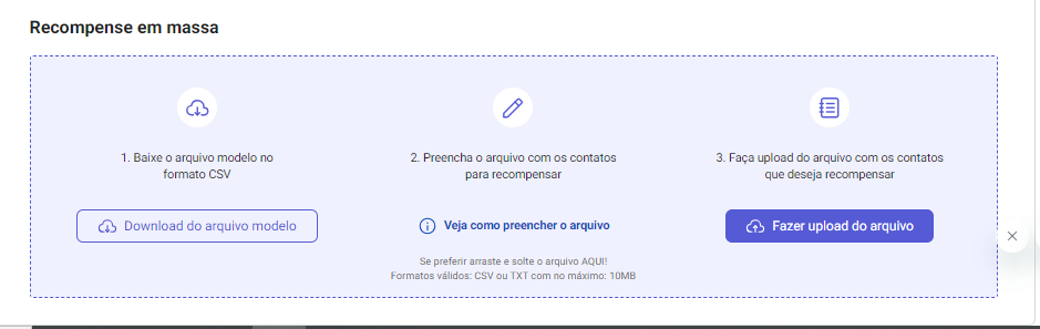 Se você quiser enviar recompensas para vários clientes ao mesmo tempo, é preciso subir um arquivo em formato CSV (Valores Separados por Vírgula) criado no Excel. Em vez de armazenar informações em colunas, os arquivos CSV armazenam informações separadas por vírgulas.